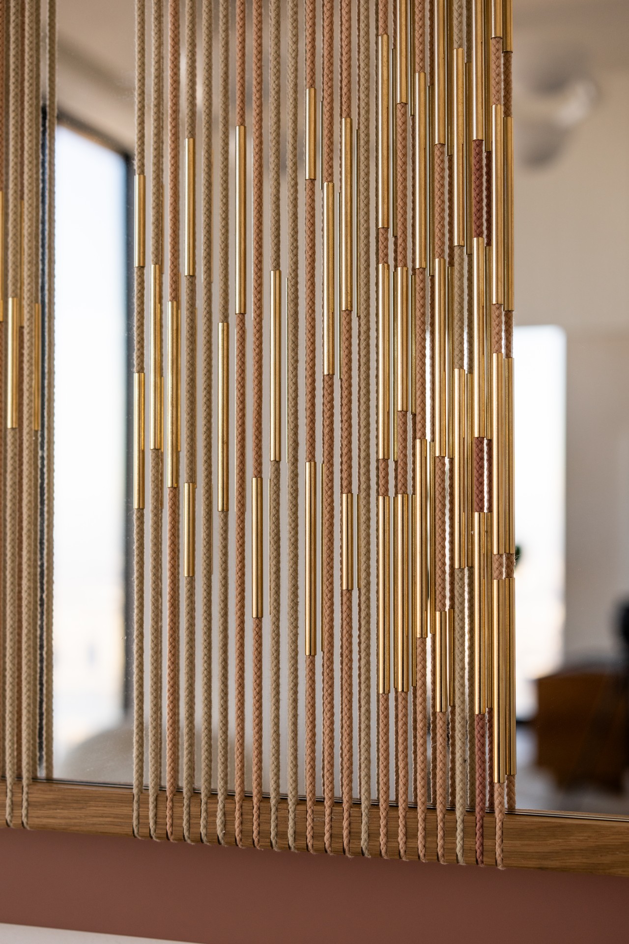 Suspended in front of the penthouse’s expansive bay windows, three-dimensional metal weavings—a contemporary reinterpretation of classic savoir-faire—engage in a dynamic dialogue with the cityscape beyond, blurring the lines between craftsmanship and architecture.